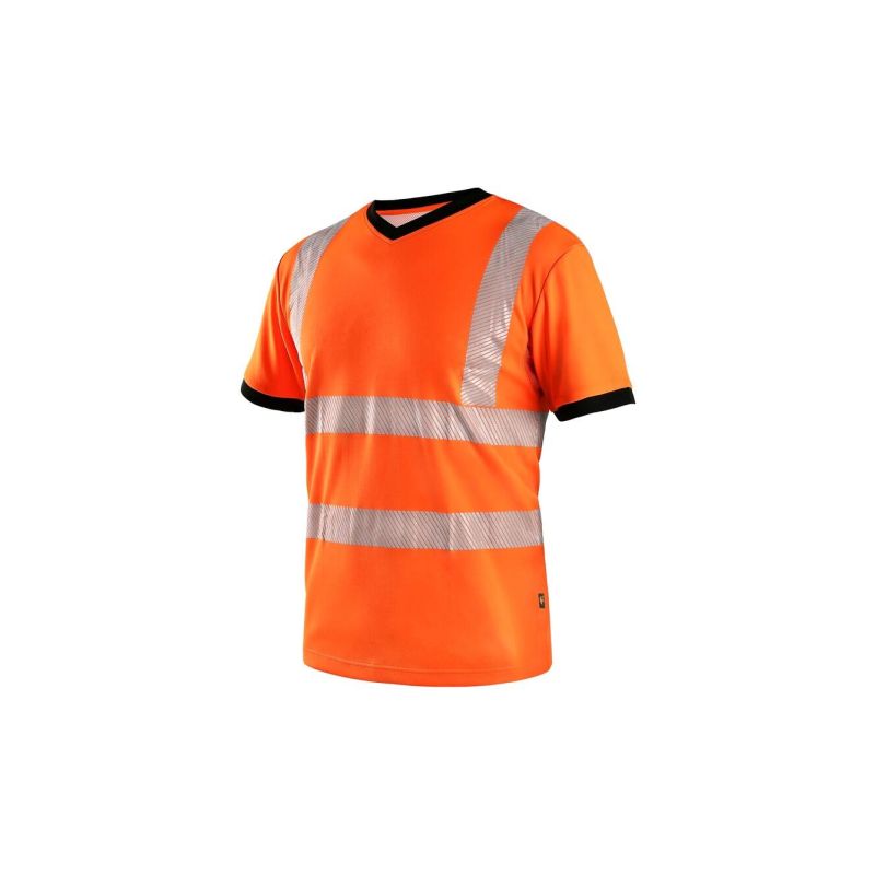 Výstražné tričko s krátkým rukávem, kontrastní olemování kolem krku a rukávů v černé barvě, průkrčník do V, zpevňující krční páska, postranní švy, větrání v podpaží, segmentované reflexní pruhy: 2 horizontální, 2 vertikální (šíře 5 cm). Doporučené použití: stavebnictví, silničáři, řidiči, logistika, údržba, kolo, motorky, skladování.